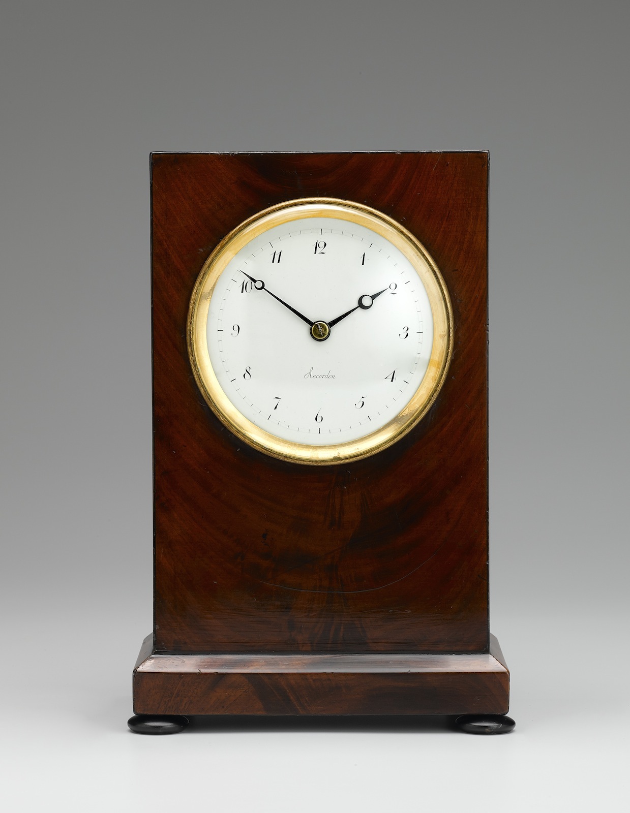 A fine Regency mahogany mantel timepiece with white enamel dial signed Recordon with arabic numerals. The eight day fusee movement with signed pendulum. The flame mahogany case with ebony edge lined corners standing on bun feet.