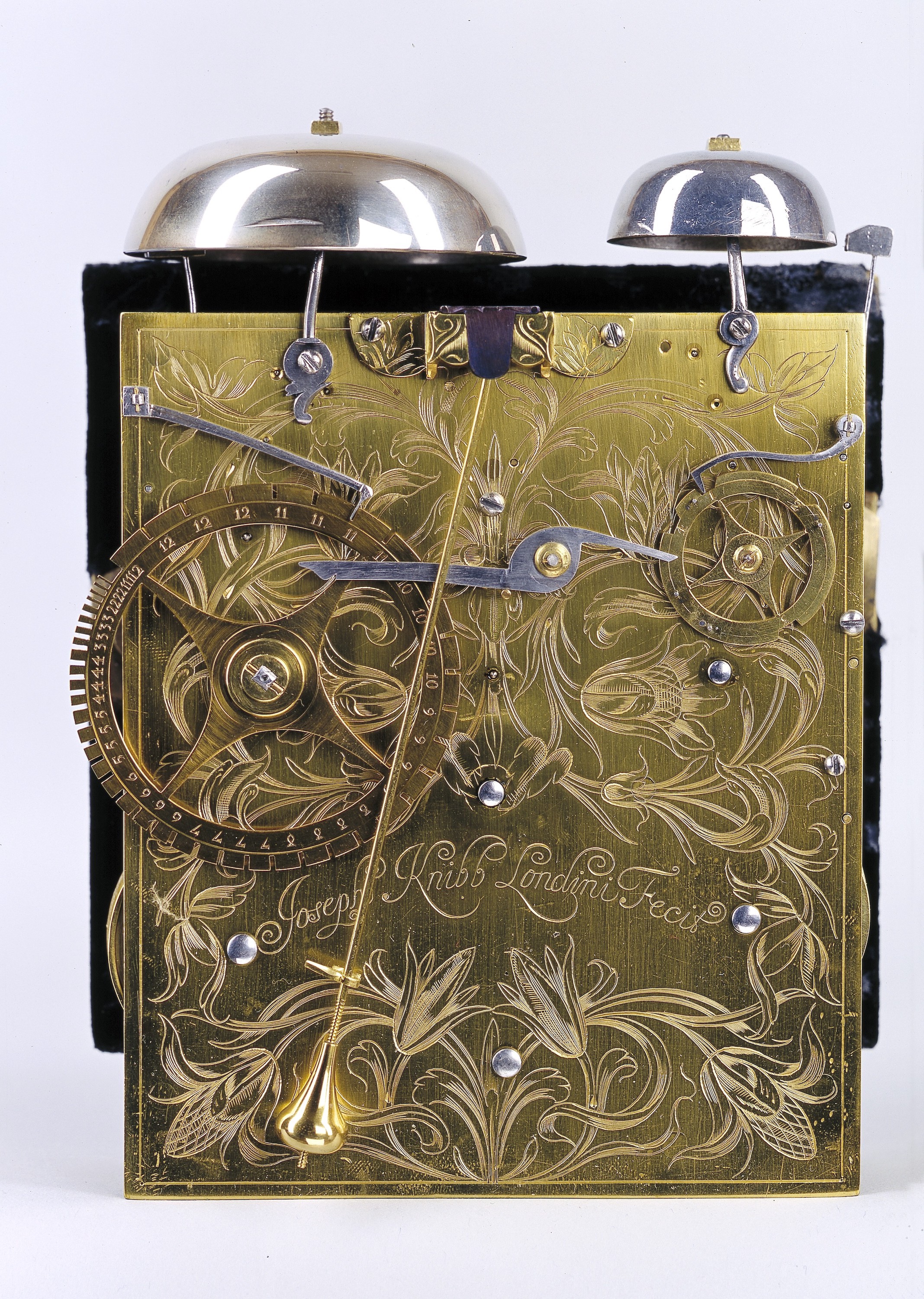 Full Grande Sonnerie three-train fusee movement with split frontplate, ten vase-shaped latched baluster pillars. Backplate engraved with tulips and scrolling foliage, signed in an arc Joseph Knibb Londini Fecit with further flowers and scrolls. Restored countwheel to the backplate numbered for every hour, releasing the hours to be struck on the larger bell above with a smaller countwheel striking all four quarters on the smaller bell above. Restored knife edge verge escapement with short bob pendulum.