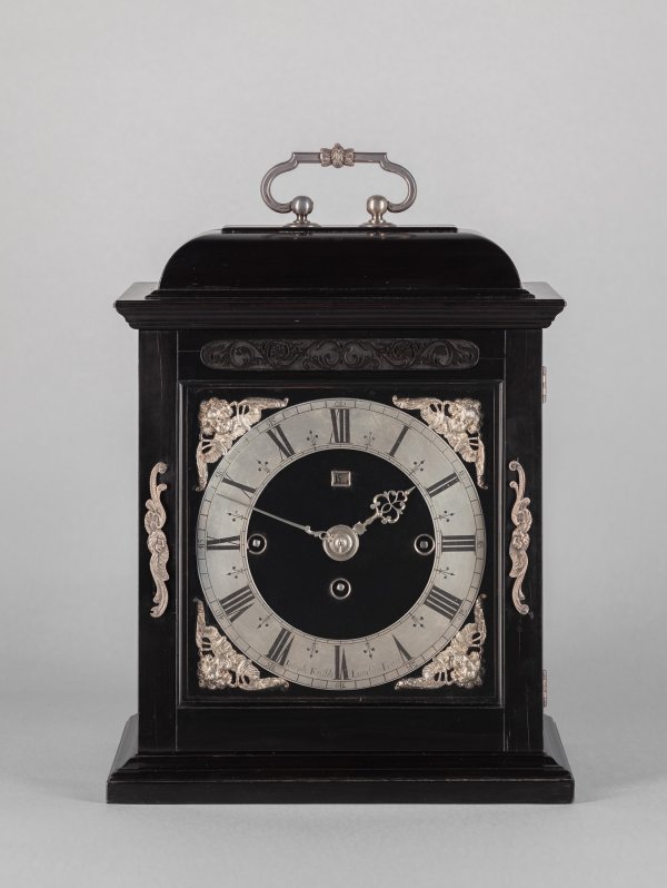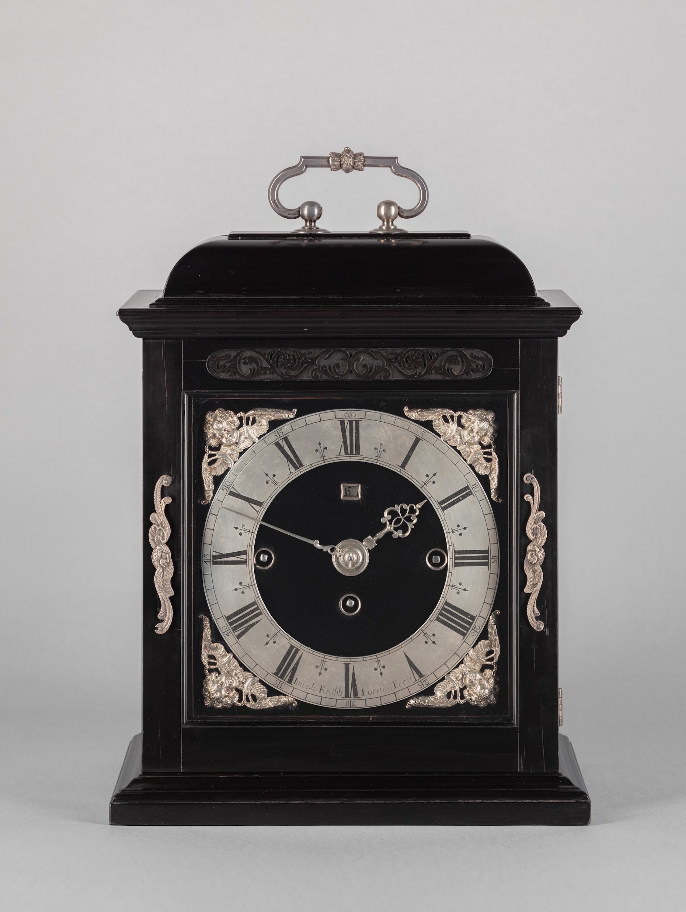 6 3⁄4 inch square brass dial with four latched feet, covered with black velvet and cast and chased silver winged cherub spandrels. Silver hands delicately pierced, shaped and chamfered. Silvered chapter ring with Roman hour numerals, fleur-de-lys half- hour markers and Arabic minutes signed Joseph Knibb Londini Fecit around VI. The velvet dial centre with plain silver ferrules to the three winding holes and date aperture below XII.