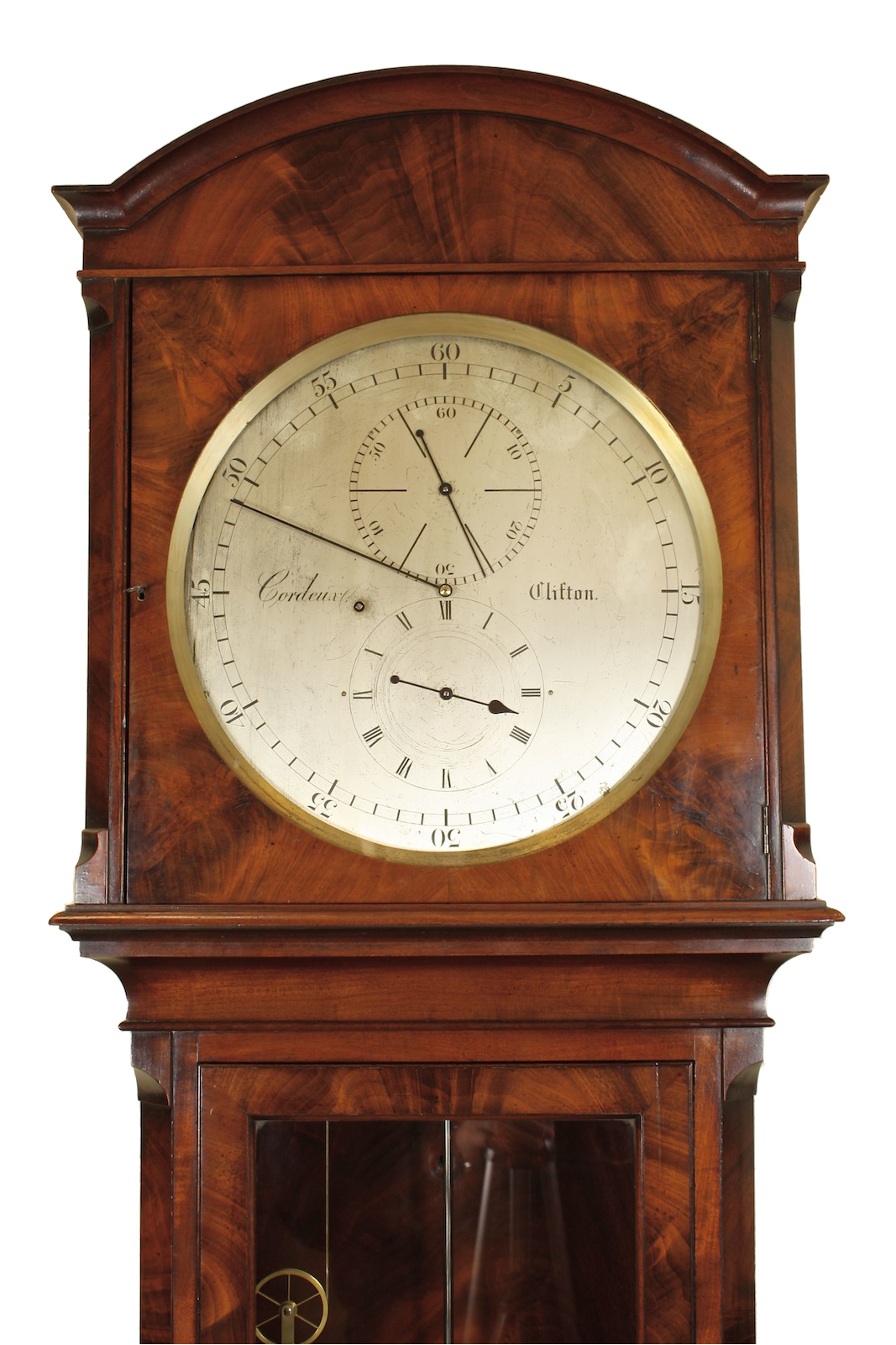 Mahogany longcase regulator with round silvered dial signed Cordeux Clifton, subsidiary seconds dial with Observatory markings, blued steel hands.