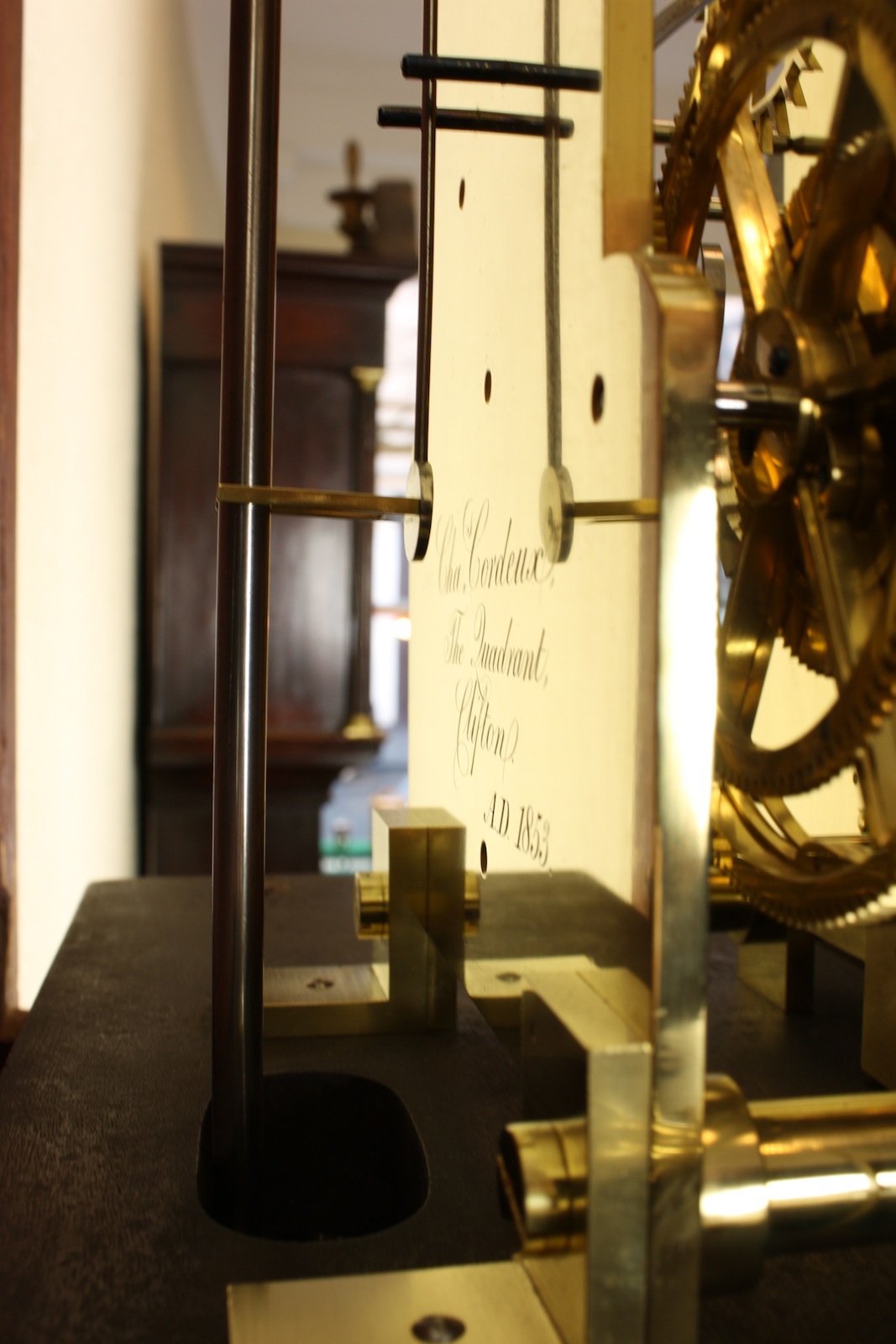 Substantial five pillar movement with shouldered plates, signed on the backplate Chas. Cordeux The Quadrant Clifton A.D 1853. Fine six spoke wheelwork and high count twelve leaf pinions, Harrison