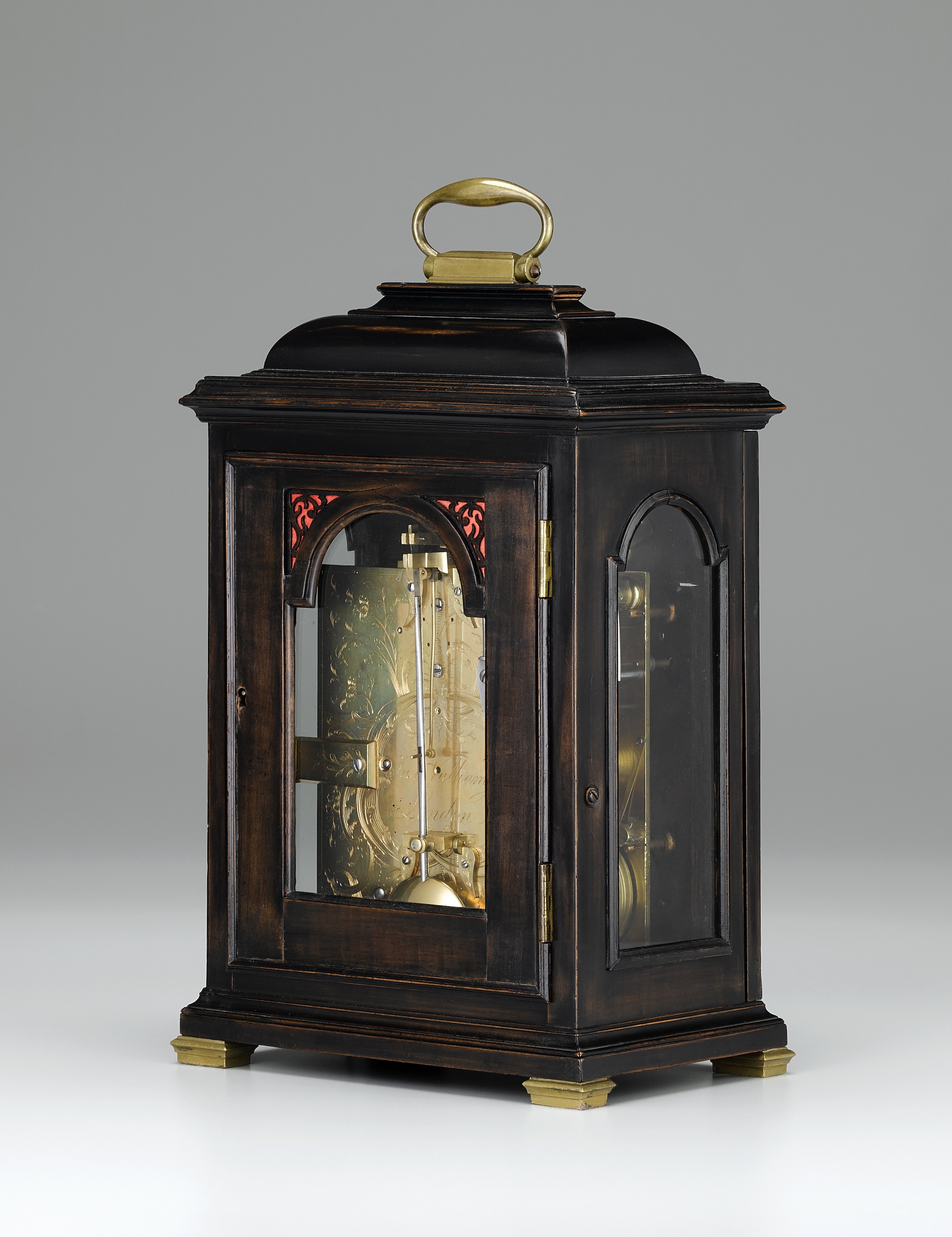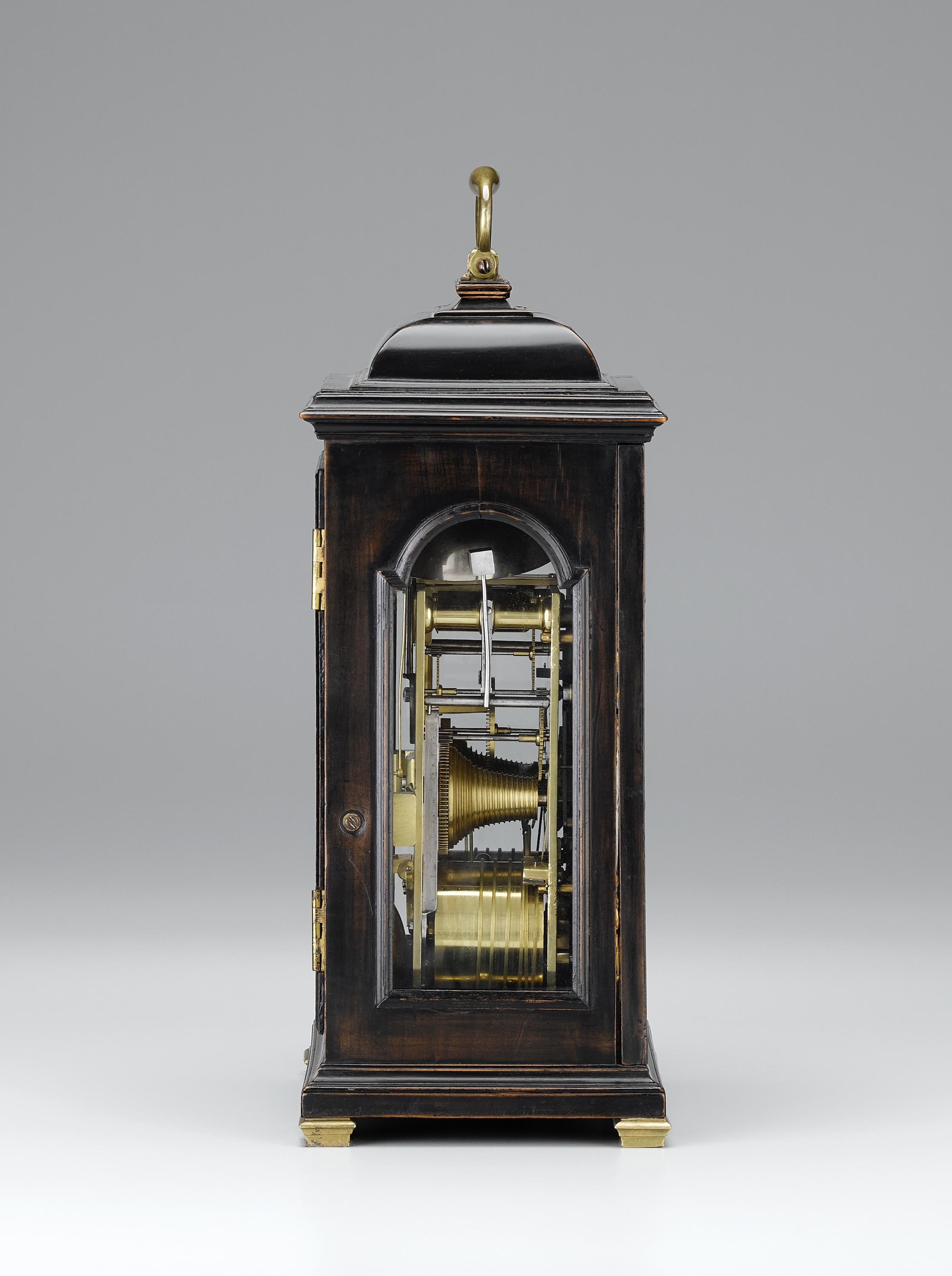 Ebonised fruitwood on oak having a shallow inverted bell top case with a brass carrying handle and sound frets. Fine mouldings surround the glazed apertures. Standing on brass block feet.