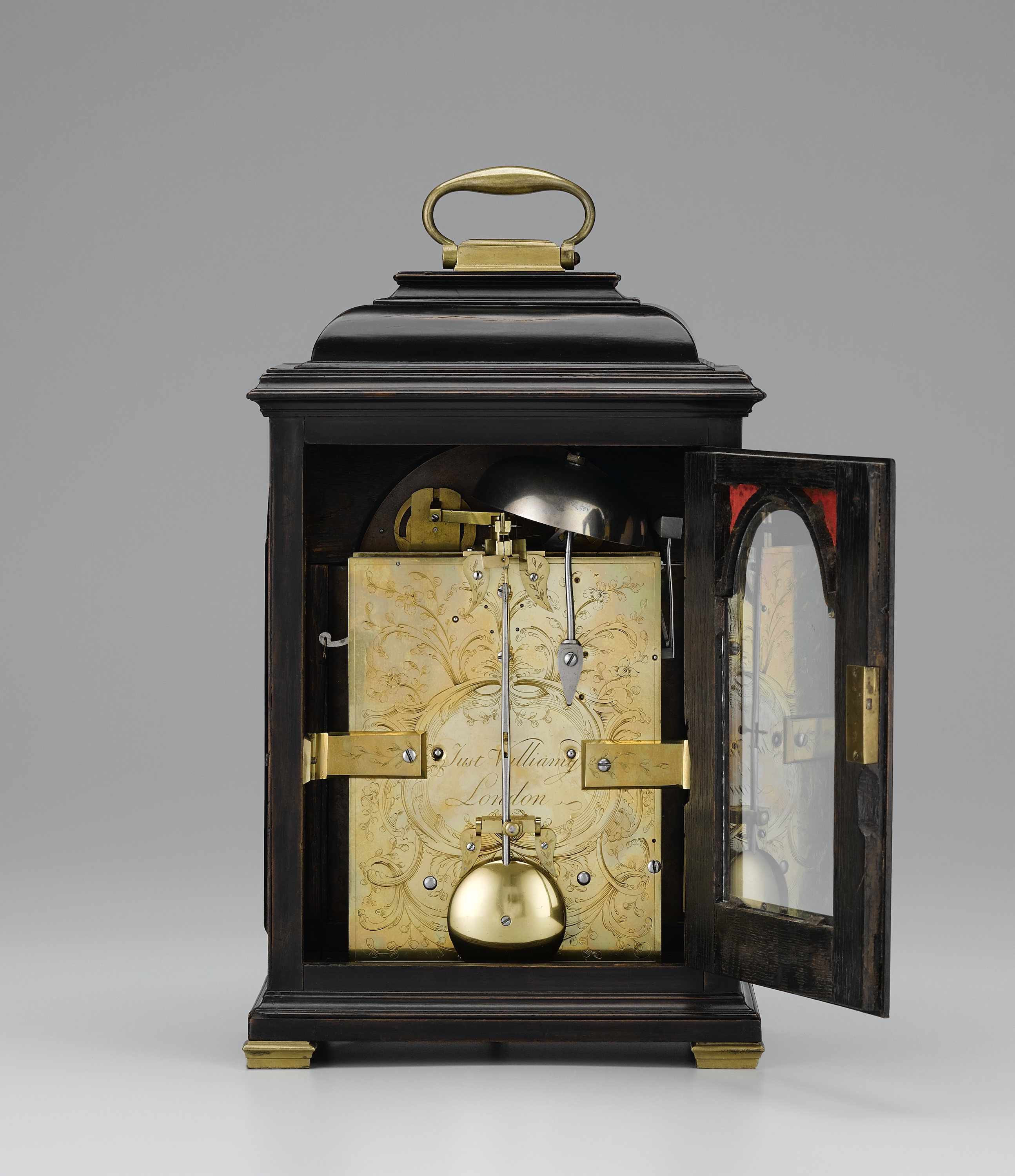 Substantial five pillar movement with verge escapement. Striking the hours on a bell. Floral engraved backplate with finely engraved signature Just' Vulliamy London. Drop down pendulum holdfast.