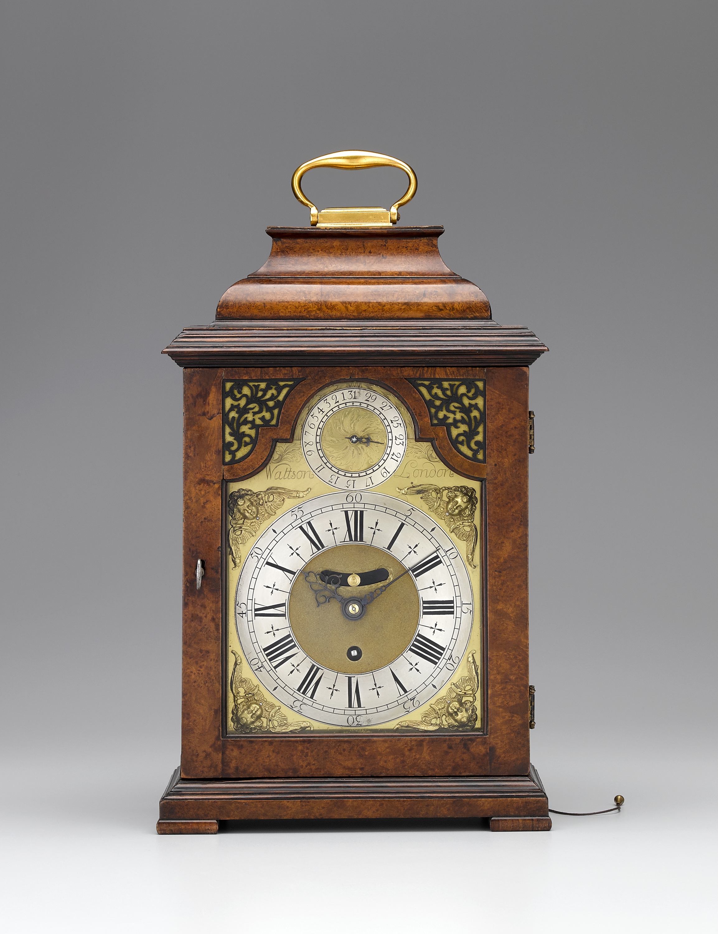 The 7 inch brass dial with shouldered arch set with a silvered subsidiary date ring marked 1-9 consecutively, then 11-31 with odd numbers only, engraved to the centre, flanked by the signature and foliate engraving. Silvered Roman and Arabic chapter ring with lozenge half-quarter marks and arrowhead half hour markers, the finely matted centre with engraved, chamfered, mock pendulum aperture. Framed by four winged cherub head spandrels